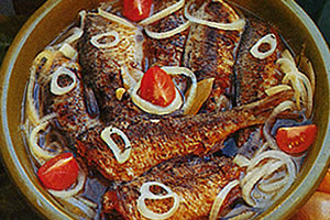 Die gut vorbereiteten Rotaugen in Mehl wenden, die Butter in einer Pfanne erhitzen, die Rotaugen hineinlegen und unter öfterem vorsichtigen Umwenden in etwa 10 Minuten goldbraun braten. Das Wasser mit dem Essig, den Gewürzen und den geschälten, in Ringe geschnittenen Zwiebeln aufkochen und diesen Sud abgekühlt über die gebratenen Rotaugen gießen.
